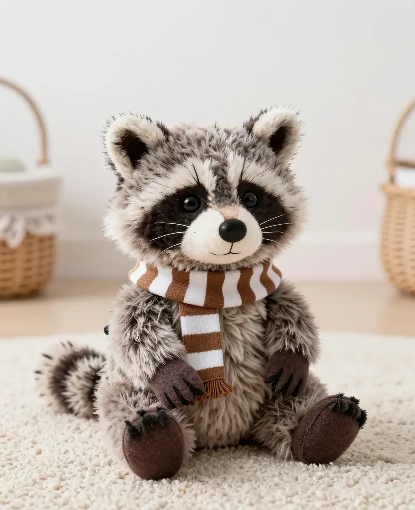 A soft, fluffy plush raccoon wearing a striped scarf sits on a white rug, illuminated by soft, diffused lighting that highlights its textures and creates gentle shadows. The neutral, light-colored background with woven baskets adds a cozy, homey feel, offering ample copy space for design purposes.