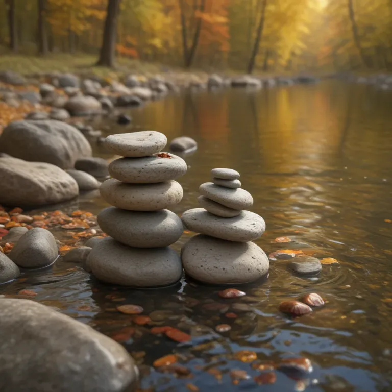 Smooth, rounded stones are balanced on the water's surface, reflecting the warm, golden hues of autumn foliage. The blurred background of the riverbank and scattered rocks adds depth and context to the serene scene.