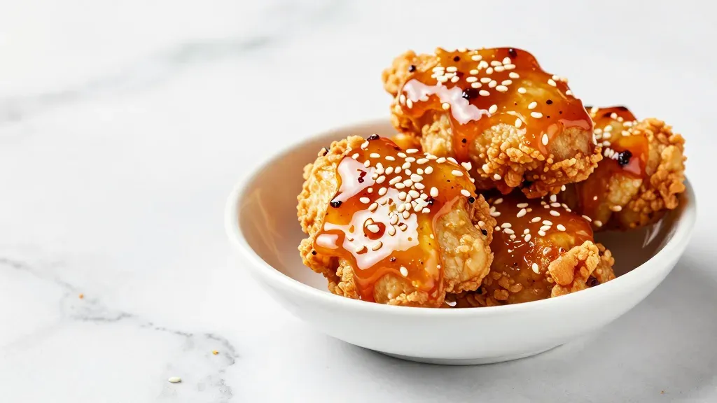 Crispy chicken bites coated in a viscous amber sauce and topped with granular sesame seeds, presented in a white ceramic bowl. Soft diffused lighting creates subtle highlights on the sauce and seeds, with shallow depth of field and negative space on the left enhancing focus on the dish.