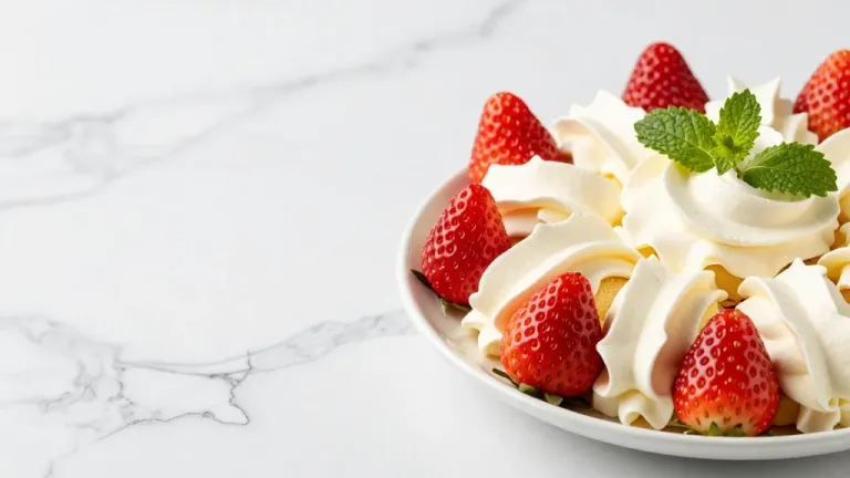 A beautifully arranged strawberry shortcake with glossy strawberries, light whipped cream, and a fresh mint leaf, set against a clean white marble background. The soft, diffused lighting highlights the textures and creates a warm, inviting glow, making the dessert visually appealing and ready for use in culinary or food-related content.