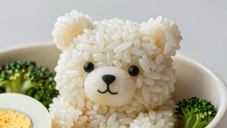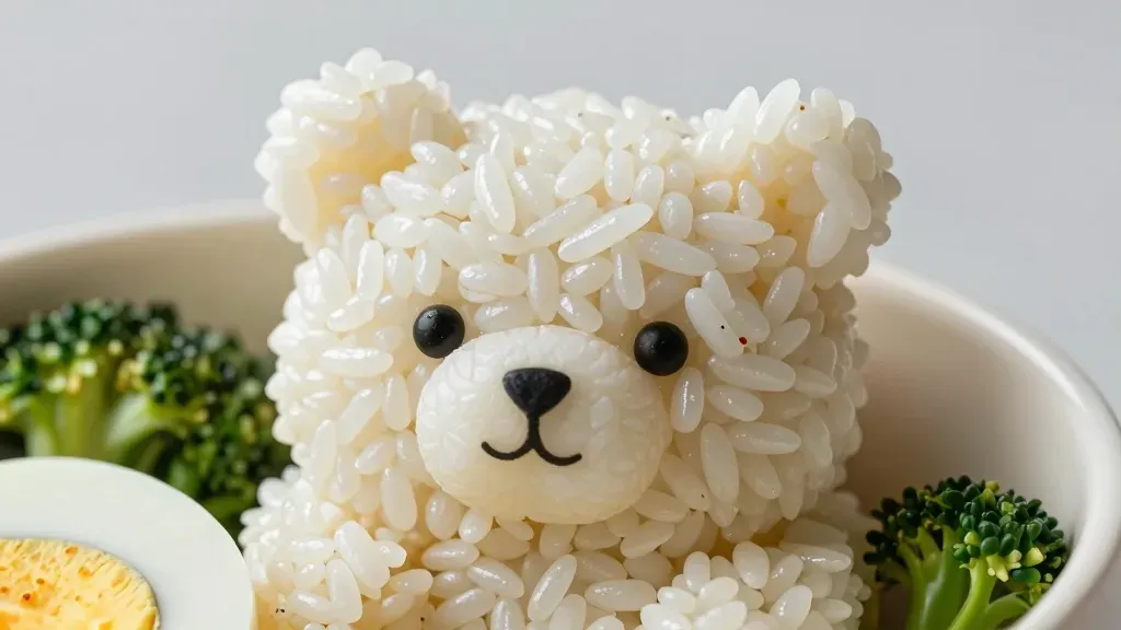A close-up of a bear-shaped bento box made of glossy white rice, with black sesame seeds forming the eyes and nose, and green broccoli and yellow carrot slices in the background. The soft, diffused lighting highlights the texture of the rice, creating a shallow depth of field that emphasizes the subject.