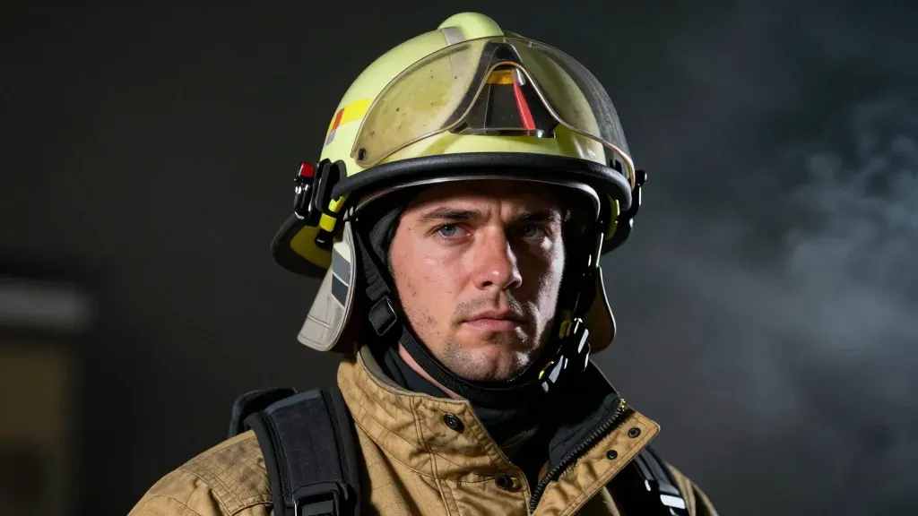 A firefighter in a yellow helmet and tan jacket stands in a smoky, dimly lit environment, highlighting the glossy texture of the helmet and the rugged material of the jacket. The shallow depth of field and focused lighting create a dramatic, high-contrast image.