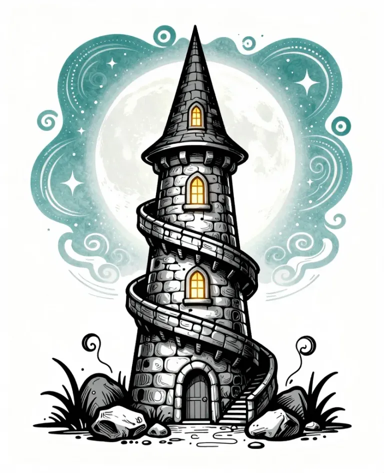 A spiraling stone tower with arched windows bathed in warm light, set against a luminous moon and swirling clouds. The composition draws the eye upwards, creating a sense of mystery and enchantment.