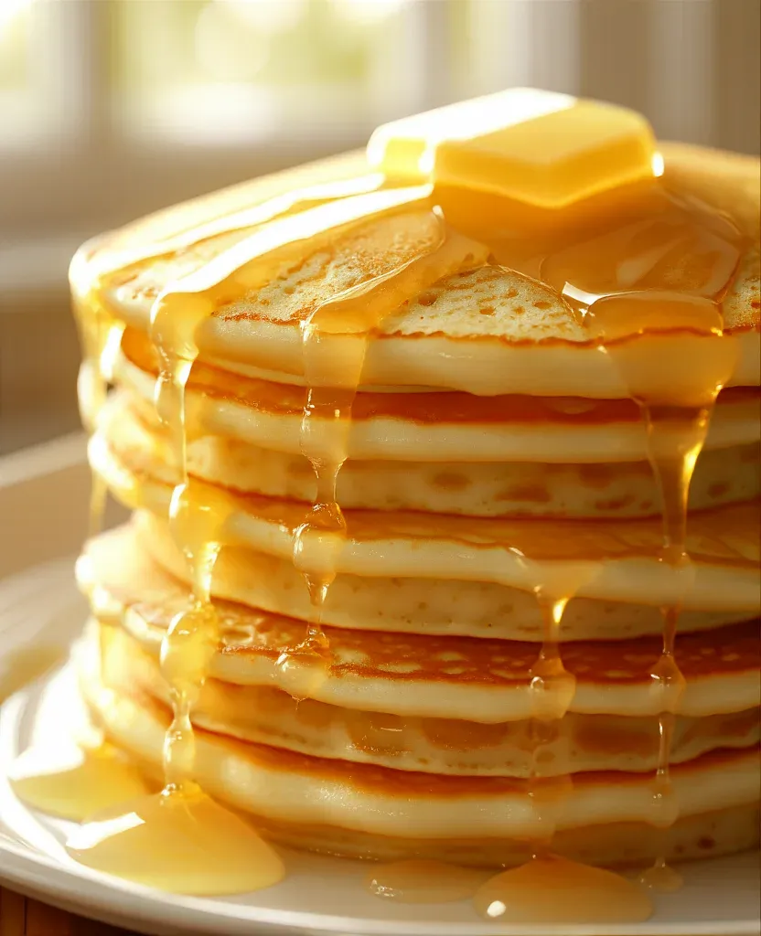 A stack of golden pancakes glistens with syrup and butter, highlighting their glossy texture and soft, creamy appearance. The warm, soft lighting enhances the depth and focus on the topmost pancake, creating a cozy, homey atmosphere.