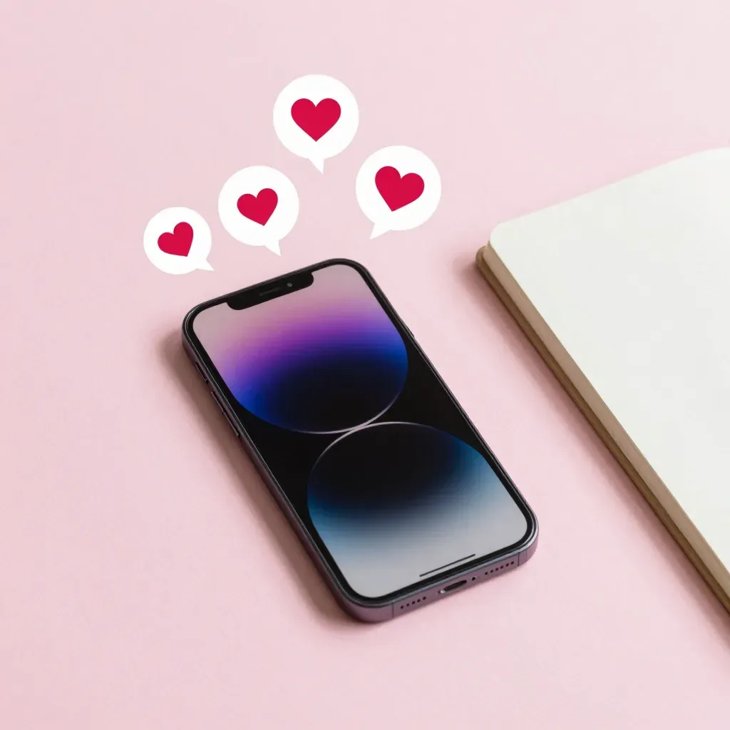 A sleek smartphone with a gradient screen displays floating heart icons against a soft, pastel pink background. The diffused lighting highlights the phone and notebook, creating a clean and minimal composition.