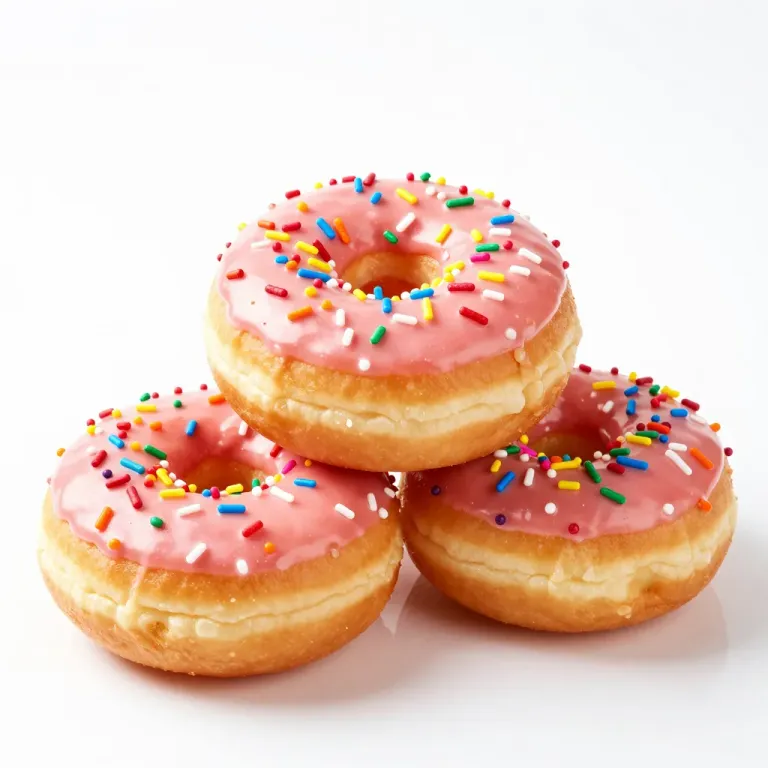 Three golden-brown donuts stacked in a pyramid, each topped with glossy pink icing and colorful sprinkles, illuminated by soft, diffused light that highlights the vibrant textures and colors, creating a clean and focused composition against a plain white background.