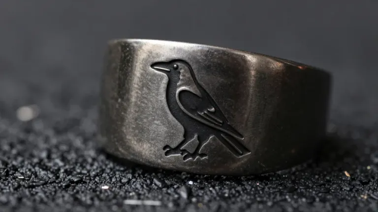 A close-up of a gunmetal raven ring, showcasing its etched raven detail and rough, polished texture under soft, diffused lighting. The dark, textured background ensures the ring remains the focal point.