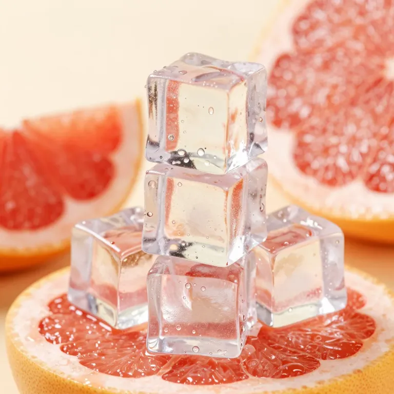 Stacked ice cubes with a glossy surface rest on a juicy grapefruit slice, illuminated by soft, diffused light that creates gentle highlights and subtle shadows, enhancing the texture and color contrast between the ice and fruit.
