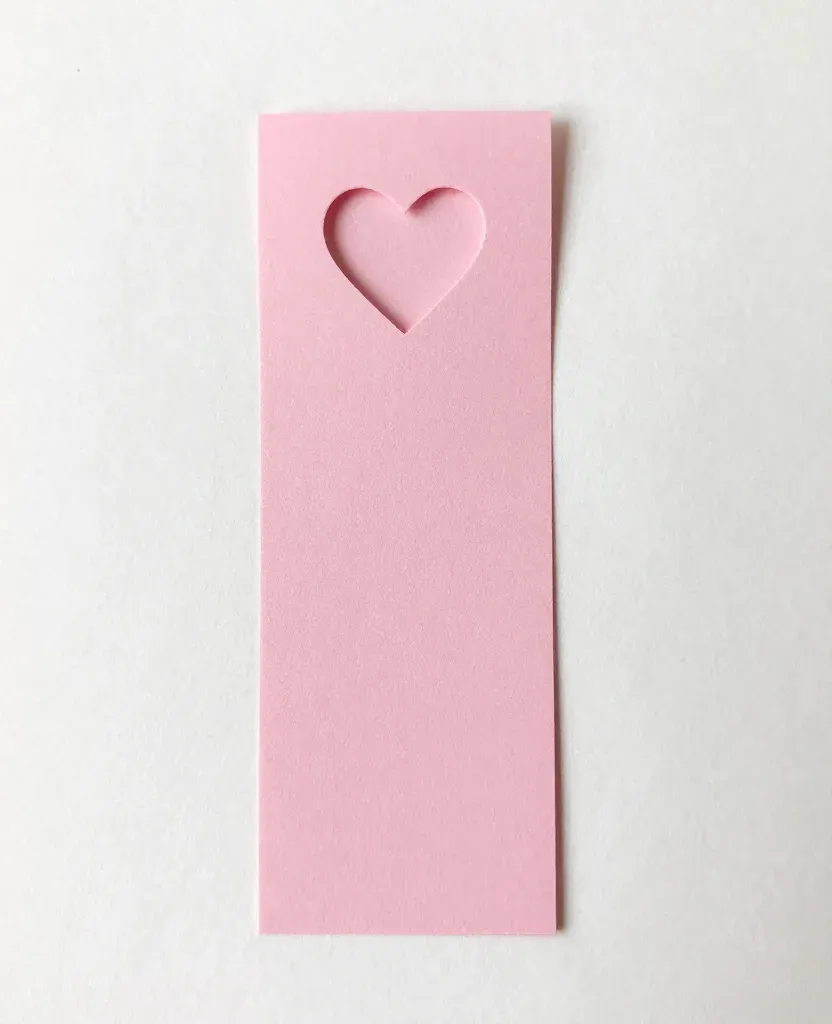 A smooth, glossy pink bookmark with a heart-shaped cutout, softly lit from above, creating gentle shadows against a white background. The clean composition and uncluttered background provide ample copy space for text or design elements.