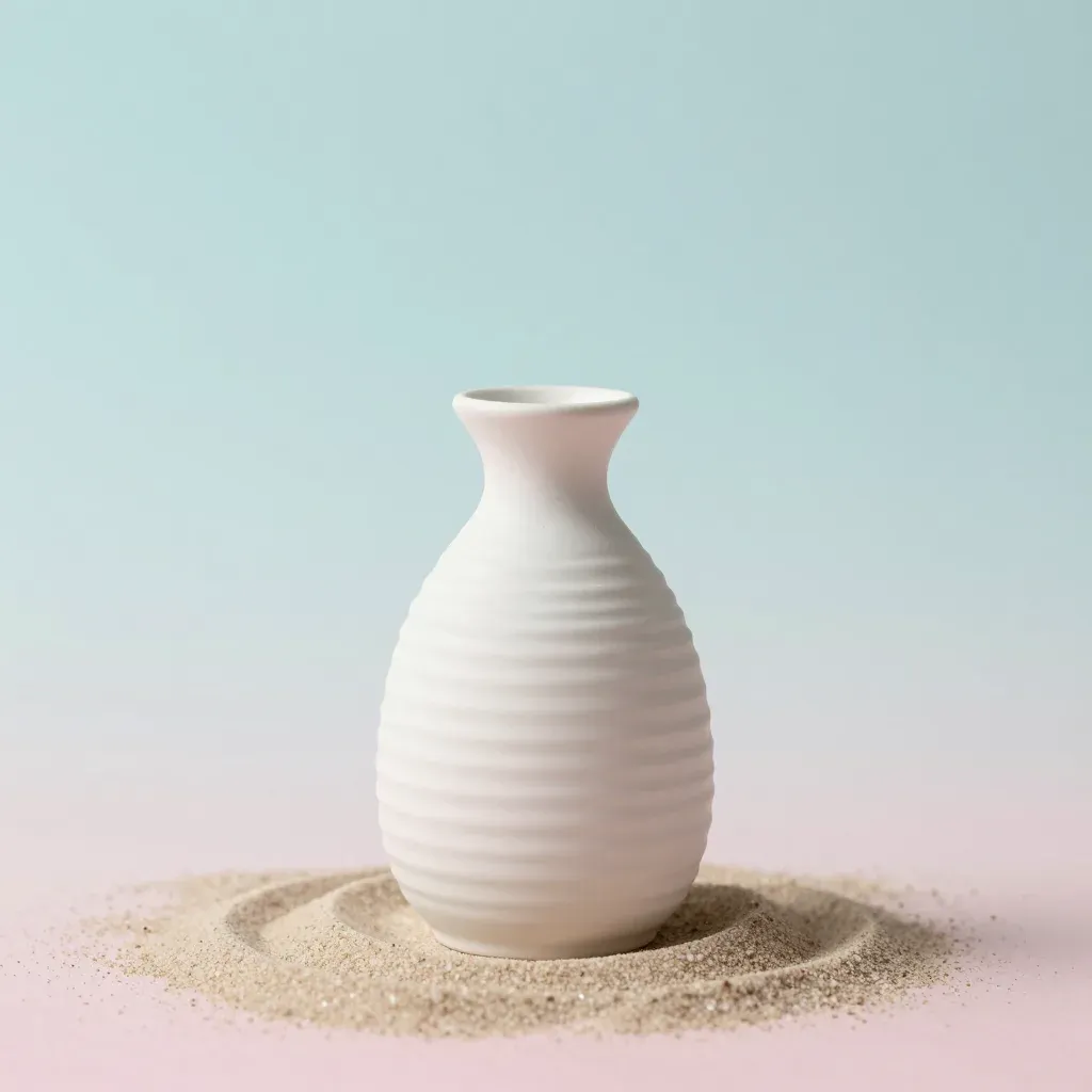 A white ceramic vase with a ribbed texture sits atop a bed of fine sand, illuminated by soft, diffused light that creates gentle shadows and highlights, emphasizing the tactile surface and the serene composition against a blurred gradient background.