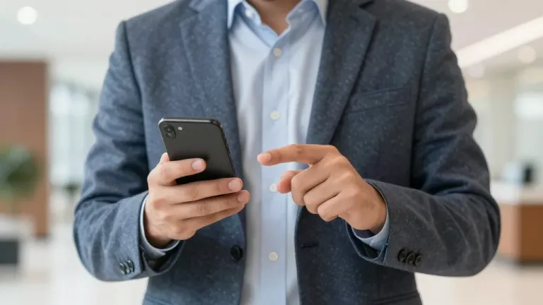 A man from the chest up, wearing a charcoal grey wool-blend blazer and light blue shirt, holds a matte black smartphone in his left hand while his right index finger taps the screen. Soft, diffused overhead lighting creates highlights on the collar and shoulder, with a shallow depth of field blurring the modern office background to emphasize the hands and device.