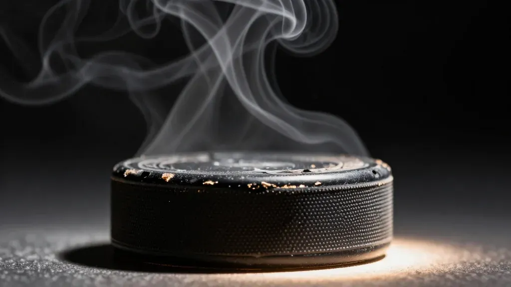 A close-up of a charred hockey puck emitting smoke under warm, golden directional lighting, emphasizing its glossy to rough texture and shallow depth of field against a dark, blurred background.