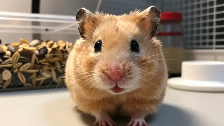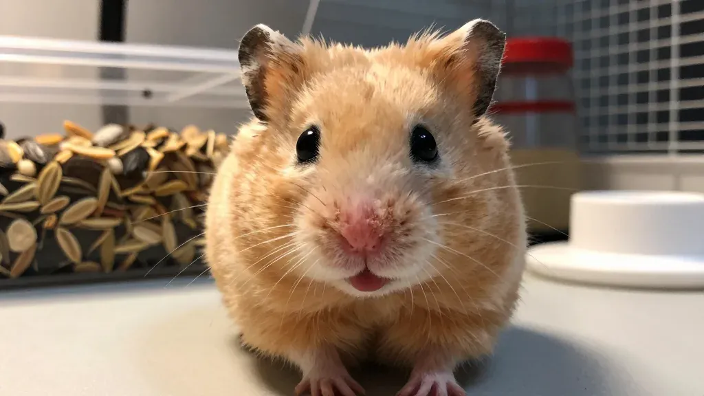 A golden-brown hamster with slightly puffed-out cheeks sits in a softly lit environment, showcasing its fluffy fur and white whiskers. The shallow depth of field and blurred background with seeds and a red and white container add a natural and intimate feel to the composition.