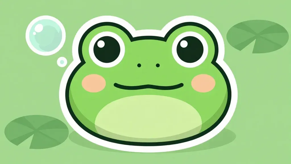 A cute green frog with glossy eyes and rosy cheeks gazes directly at the viewer, surrounded by soft ambient light and lily pads. The composition is centered with a shallow depth of field, creating a serene and inviting background.