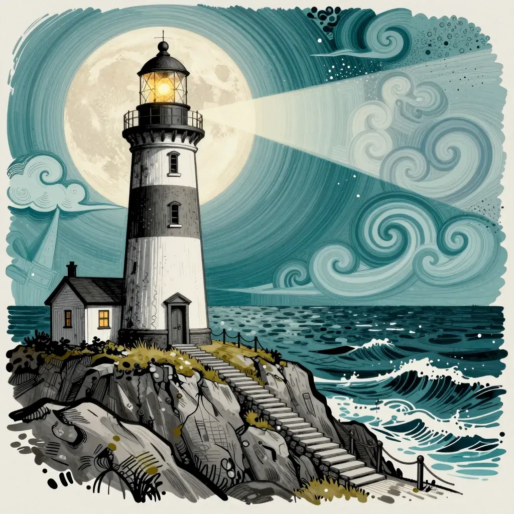 A serene night scene featuring a lighthouse casting a warm glow over a rugged cliff and keeper's cottage, with dynamic swirling clouds and crashing waves in the background, creating a dramatic and peaceful atmosphere. The soft moonlight highlights the textures of the stone and the glossy cliff face, emphasizing the depth and scale of the scene.