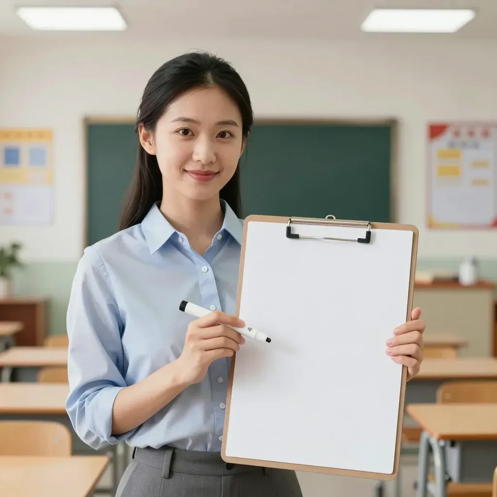 A young woman in a classroom setting holds a clipboard and marker, with soft, even lighting from overhead fluorescent lights creating minimal shadows. The background, slightly blurred, features desks, chairs, and a chalkboard, emphasizing the subject.
