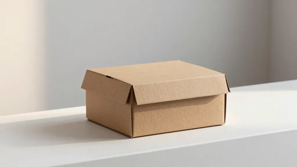 A cluster of brown cardboard boxes, rough and corrugated, softly lit with diffused light creating gentle shadows. The minimalist white surface and plain gray wall in the background, slightly out of focus, provide a clean and uncluttered setting.