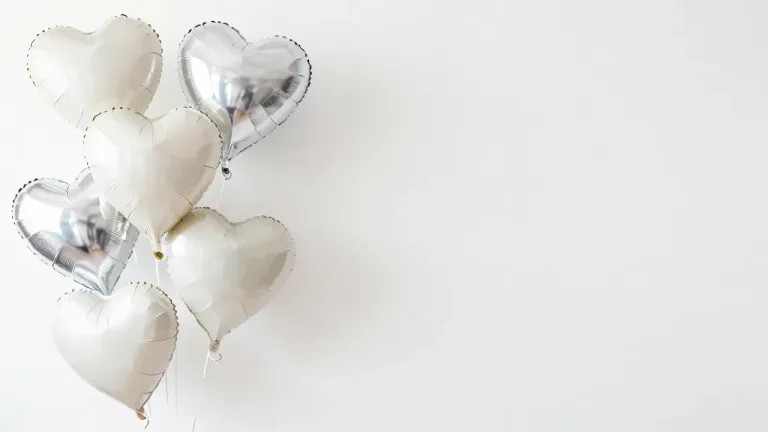Glossy, reflective heart-shaped balloons clustered together in a soft, diffused light, creating a sense of depth and elegance against a pure white background. The minimalistic composition and even lighting highlight the balloons' smooth texture and subtle silver reflections, making it ideal for wedding or celebratory themes.