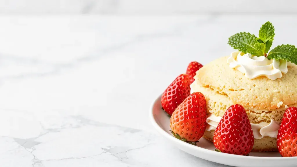 A delectable strawberry shortcake with layers of sponge cake, cream, and fresh strawberries, garnished with mint leaves, set against a clean white marble background. Soft, diffused lighting highlights the textures and colors, creating a warm and inviting atmosphere.