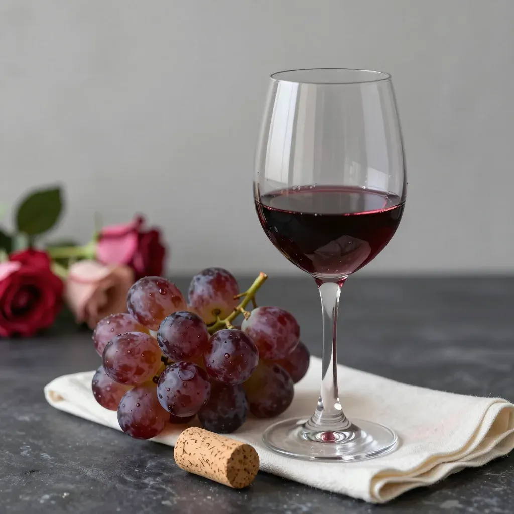 A glass of red wine and a cluster of plump grapes are the focal point, set against a soft, diffused light that highlights the rich colors and glossy textures. The blurred bouquet of roses in the background adds a romantic and warm context, creating a shallow depth of field that draws attention to the main subjects.