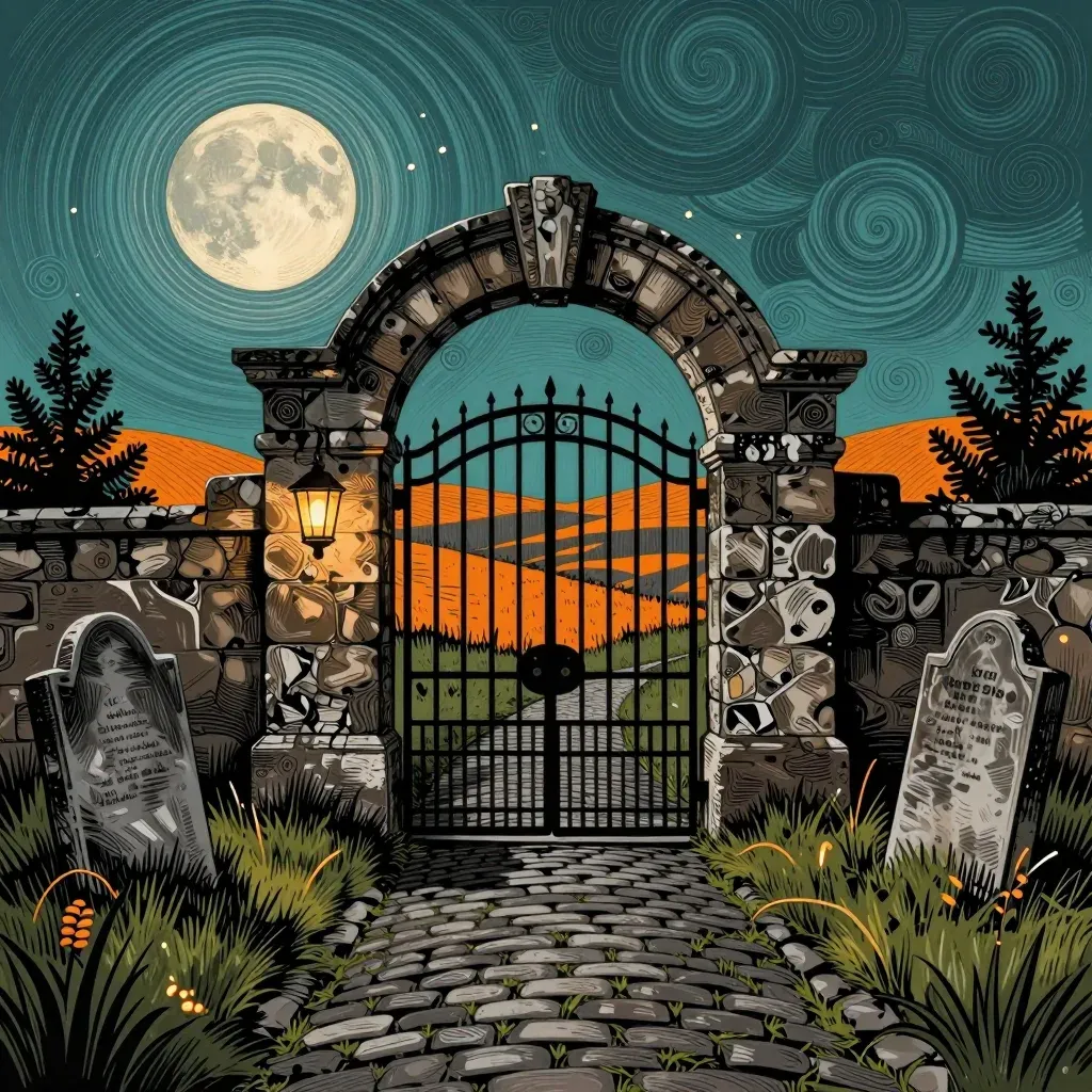 A stone archway with an iron gate and weathered gravestones bathed in the warm glow of a lantern and moonlight, creating a serene yet somber atmosphere. The symmetrical composition and leading lines through the path enhance the depth and draw the viewer into the scene.