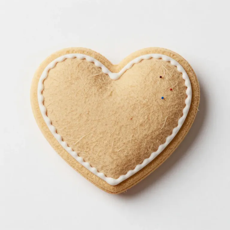A golden-brown heart-shaped cookie with glossy white icing and small pops of color from pins, set against a clean white background with soft, diffused lighting and gentle shadows, providing ample copy space for design elements.