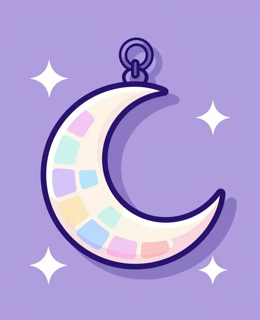 A glossy crescent moon charm adorned with pastel-colored squares, softly illuminated by diffused light from above, creating a serene and enchanting atmosphere. The charm is centered with a slight tilt, emphasizing its dynamic and elegant design against a blurred lavender background with star-like sparkles.
