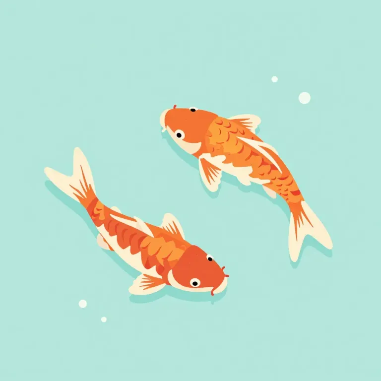 Two koi fish swim gracefully in a synchronized manner, their glossy scales reflecting soft, diffused light from above, creating gentle highlights on their bodies and the water surface. The simple, solid blue background emphasizes their graceful movement and vibrant orange and white coloration.