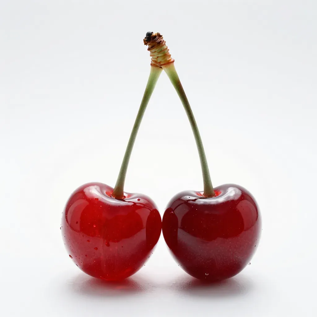 Two glossy cherries with intertwined stems, set against a clean white background, highlighting their vibrant red color and smooth texture. The soft, diffused lighting accentuates the cherries' contours and creates a shallow depth of field, emphasizing their plump form.