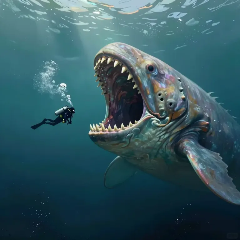 A scuba diver observes a massive sea creature with an open maw, showcasing glossy scales and sharp teeth, illuminated by filtered light from above. The deep blue ocean background provides a stark contrast to the creature's metallic silvers and black diver, creating a dramatic and immersive scene.