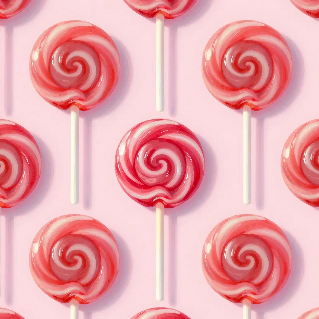 A symmetrical top-down view of glossy, creamy swirled lollipops against a soft pink background, highlighting their smooth texture and warm lighting. The clean, minimalist backdrop provides ample copy space for design integration.