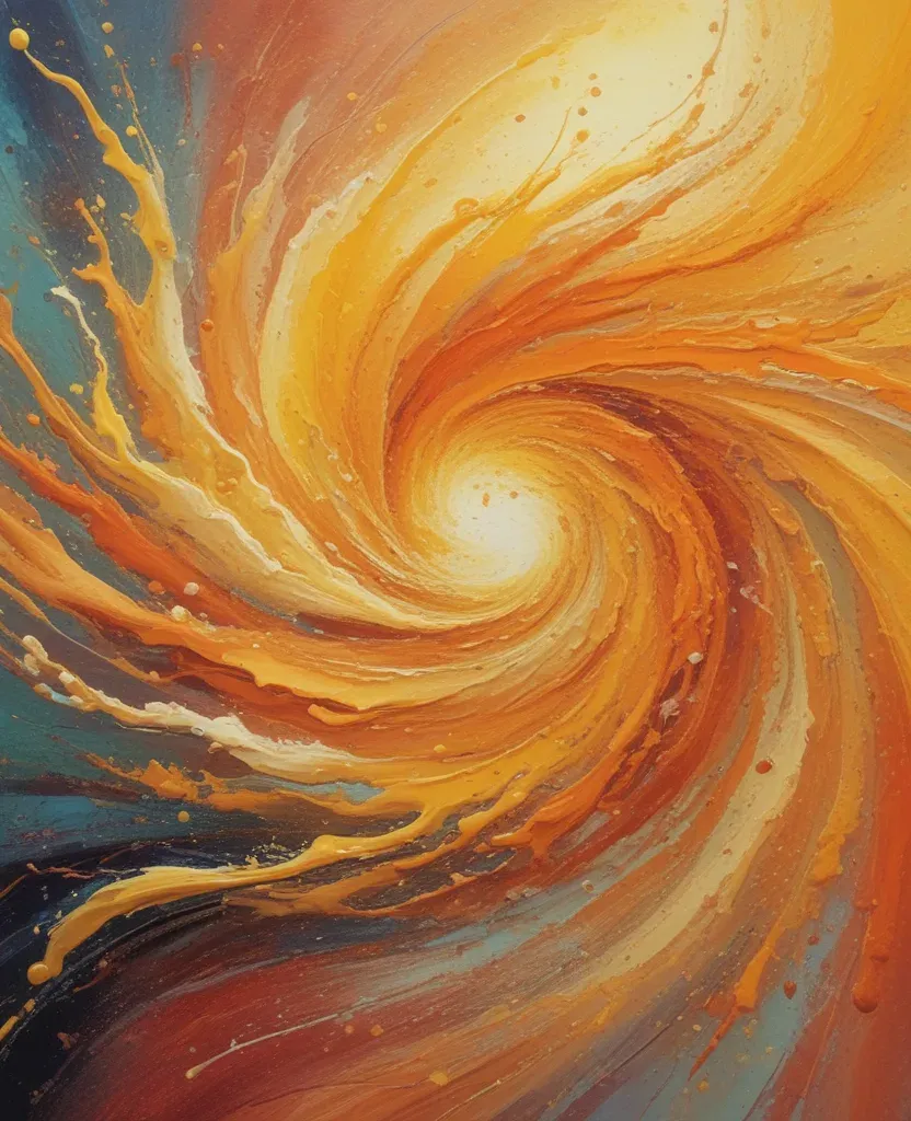A dynamic swirl of glossy paint in vibrant oranges and yellows, illuminated by a central light source that enhances the depth and texture of the layers. The blurred background ensures the central swirl stands out prominently, making it ideal for design elements requiring a focal point.
