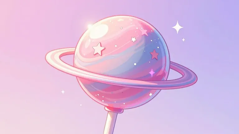 A translucent planet lollipop with glossy, smooth texture and soft, diffused light from above, creating gentle highlights and shadows, set against a blurred lavender gradient background that enhances the ethereal and dreamy mood.