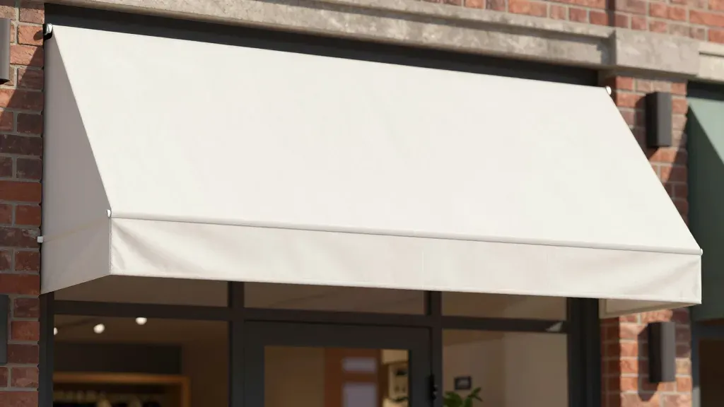 A smooth, glossy white awning frames a storefront entrance, with soft, diffused sunlight casting dappled shadows. The composition emphasizes the awning and entrance, set against a slightly blurred brick facade.