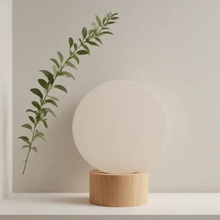 A soft, warm light emanates from a spherical lamp with a wooden base, casting gentle shadows on a plain, light-colored wall. The composition is balanced with a vertical line created by the lamp and a sprig of soft green leaves, creating a harmonious and serene aesthetic.