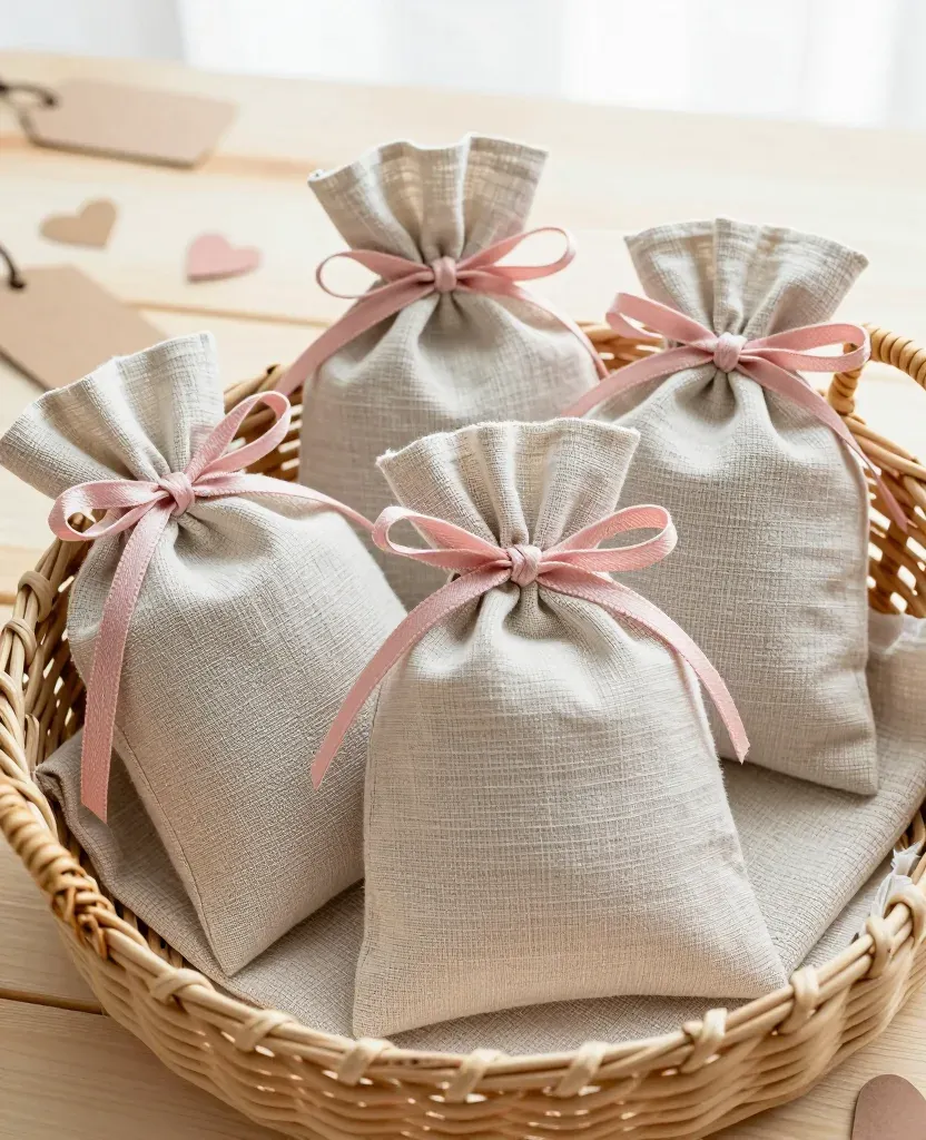 Soft linen lavender sachets adorned with delicate pink ribbons, arranged in a wicker basket under soft, diffused lighting, creating a gentle, inviting atmosphere. The shallow depth of field and neutral background highlight the textures and colors of the sachets, making them perfect for product photography and gift packaging imagery.