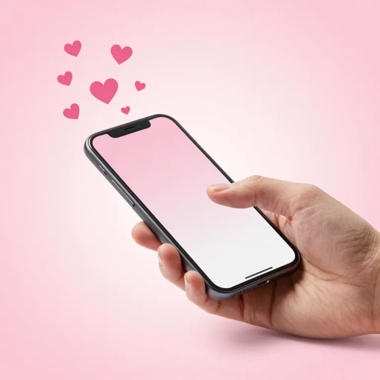 A hand gracefully swipes the screen of a glossy black smartphone, with soft, diffused light from the phone's screen creating a warm, romantic ambiance. The pastel pink background provides a clean, uncluttered backdrop, emphasizing the hand and phone with a shallow depth of field.