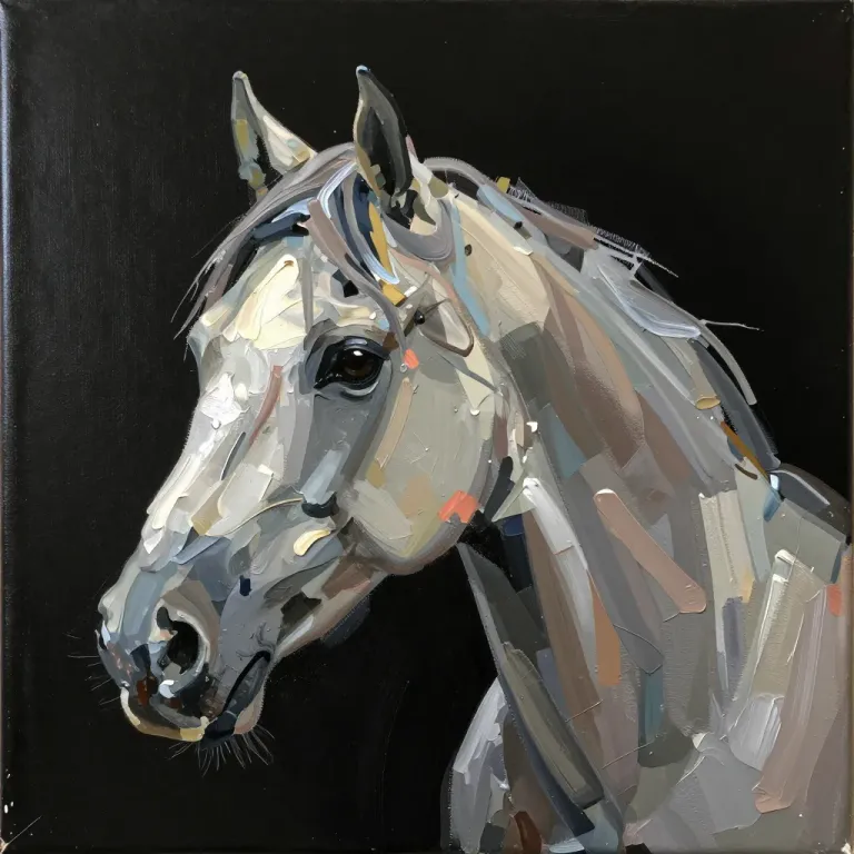 A horse's head and neck are depicted in a profile view with thick, layered brushstrokes, creating a three-dimensional effect. Directional lighting from the left casts soft shadows and highlights across the horse's features, emphasizing its texture and form against a dark, almost black background.