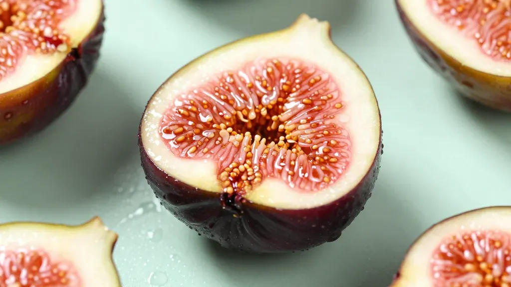 A close-up of a sliced fig reveals its soft, juicy flesh with tiny seeds, set against a clean white background that highlights the fig's natural juices and creates a fresh, dewy appearance. The soft, diffused lighting emphasizes the fig's texture and vibrant colors, making it ideal for culinary or natural product imagery.