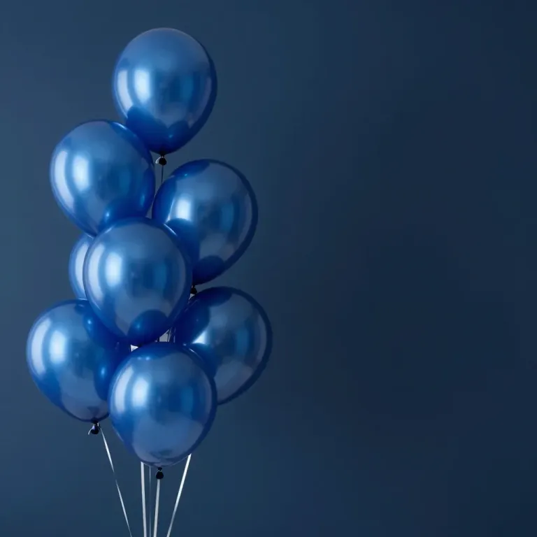 A cluster of glossy sapphire blue balloons reflects ambient light, creating highlights and a sense of depth against a dark blue background. The composition balances the balloons with white strings leading towards the bottom, providing a clean and focused utility for design elements.