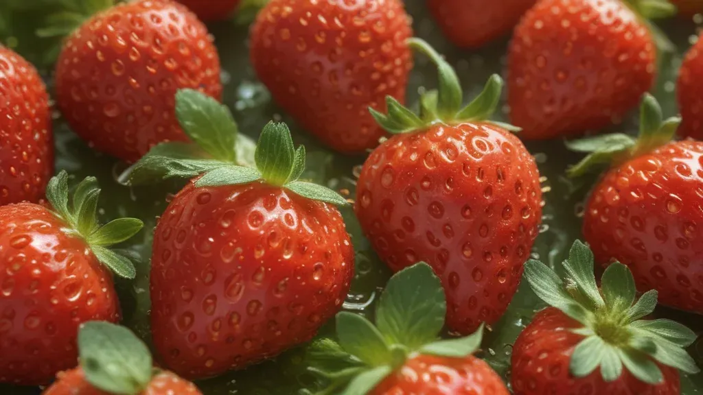 Glossy, red strawberries with green leaves and tiny seeds, highlighted by soft, diffused lighting that accentuates the texture and droplets of water. The slightly shallow depth of field and blurred background emphasize the strawberries, making it ideal for culinary or food photography.