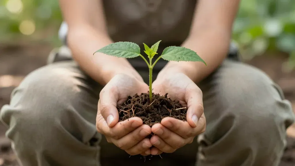 A close-up of hands gently holding a young plant with moist, gritty soil, bathed in soft morning light filtering through dappled shadows. The blurred greenery in the background suggests a serene garden setting, ideal for environmental or nature-themed designs.