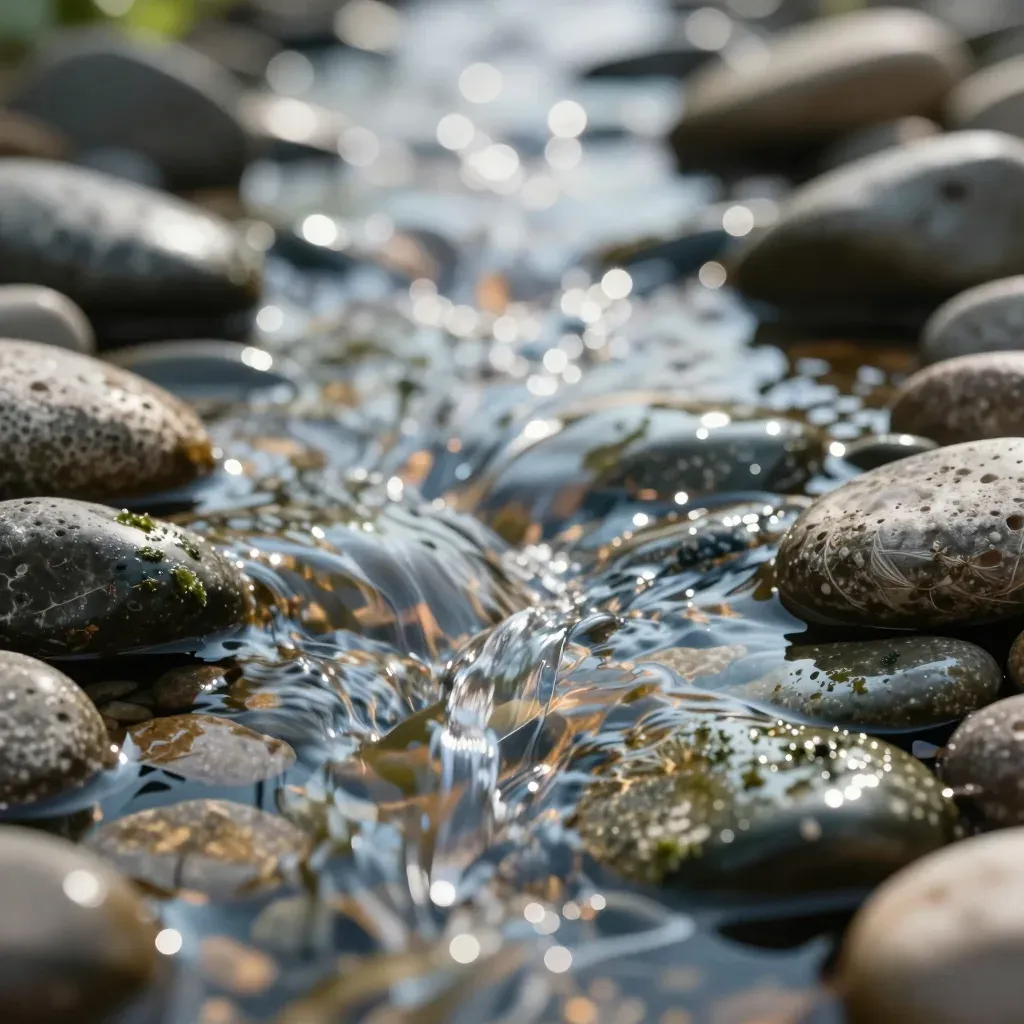 Smooth pebbles and a flowing stream reflect soft, diffused light, creating a sparkling effect on the glossy water surface. The shallow depth of field draws attention to the textures and reflections, while the blurred background enhances the sense of depth and movement.