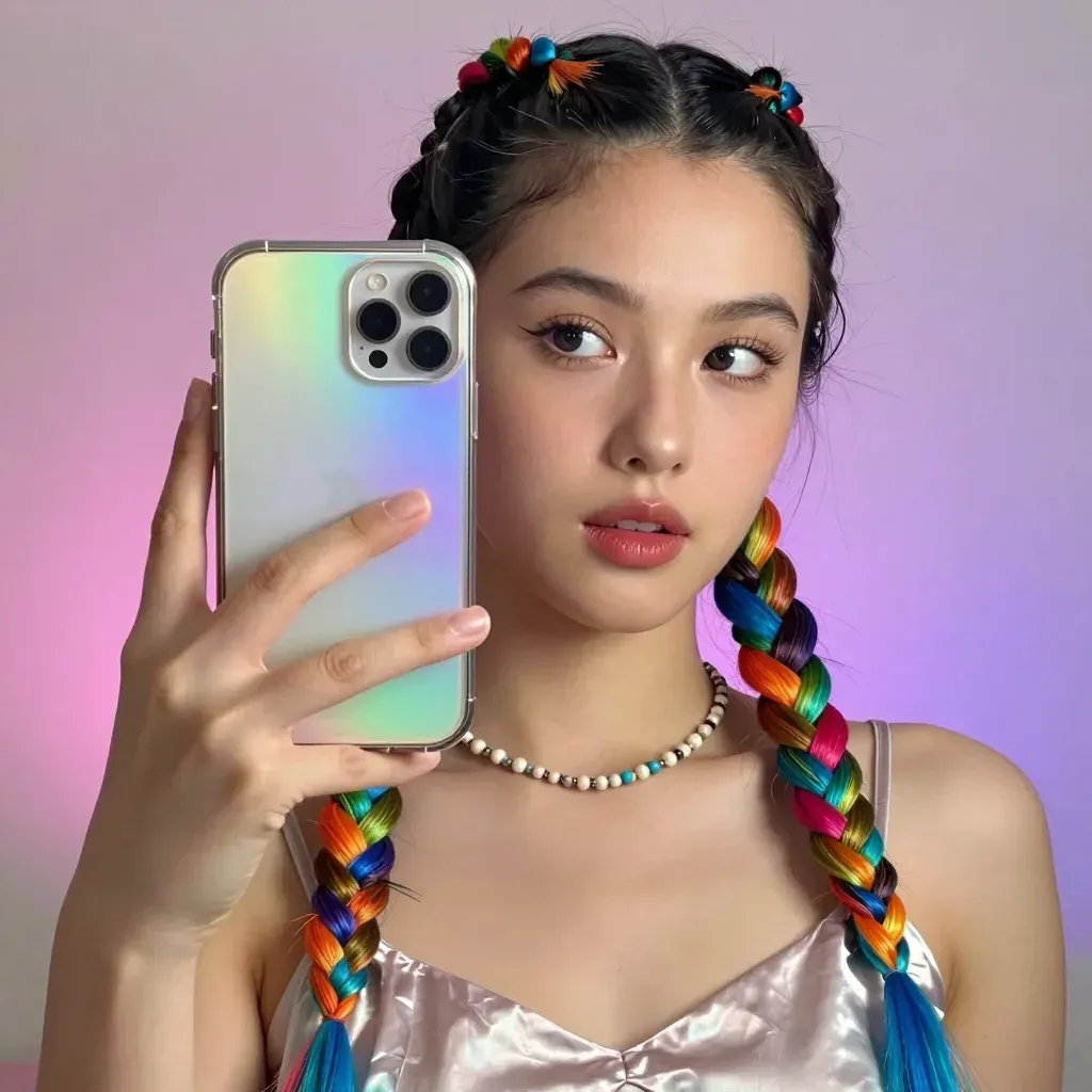 A person with vibrant rainbow braids takes a selfie with a glossy holographic phone case, set against a soft, diffused pink and purple gradient background. The lighting highlights the holographic effect and glossy textures, creating a visually striking composition.