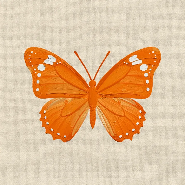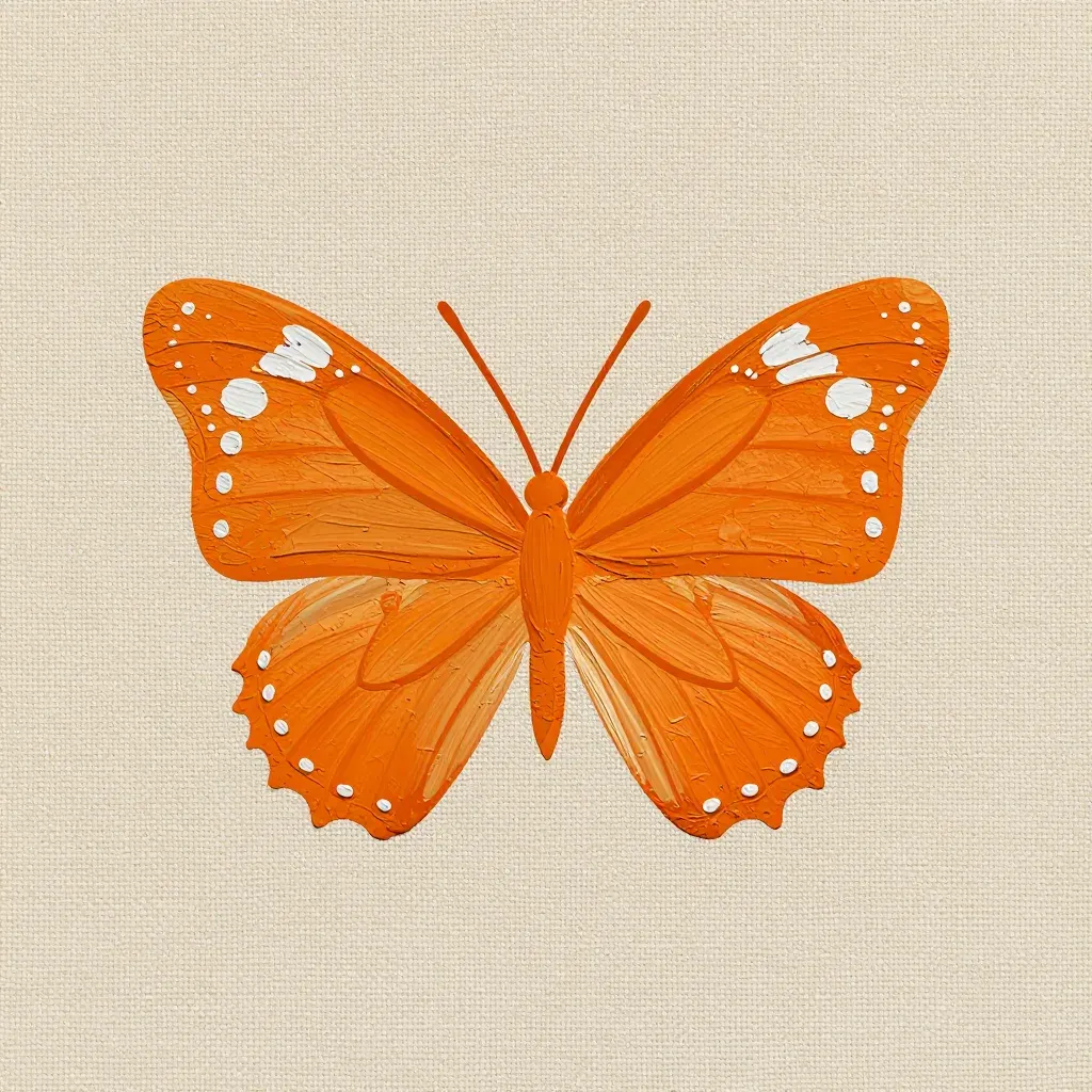 A vibrant orange butterfly with raised wings is painted on a rough canvas, mimicking natural fabric, with glossy wings and white spots. Soft, overhead lighting casts gentle shadows, creating depth and emphasizing the butterfly against a neutral beige background.