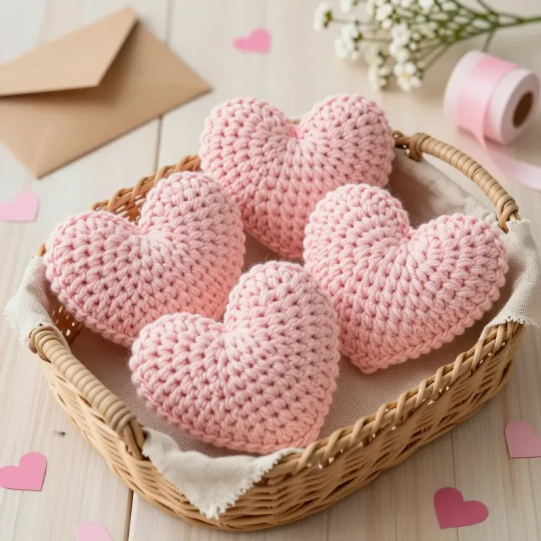 A collection of soft, fluffy crochet hearts in a wicker basket, highlighted by gentle, diffused lighting that accentuates their textured surface. The composition, with hearts slightly off-center, creates a sense of depth and invites viewers to explore the intricate details of the craftsmanship.