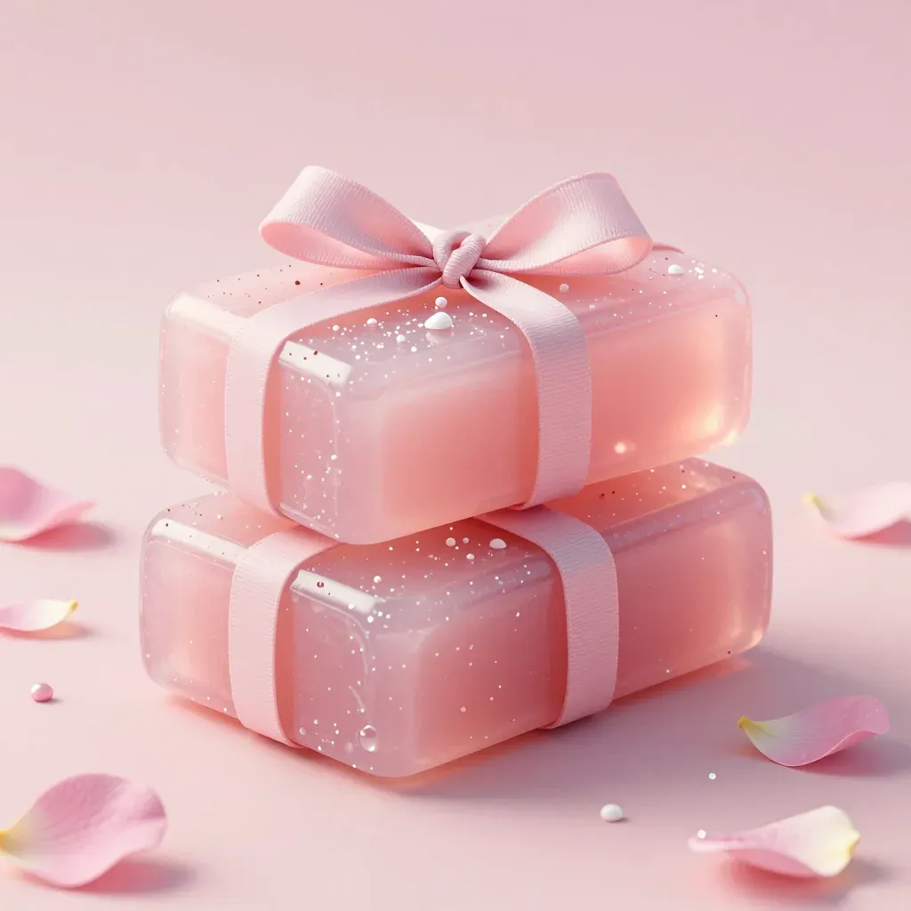 Stacked iridescent soap bars wrapped in pink ribbons, embedded with shimmering particles, softly lit to highlight their glossy texture and create gentle shadows, with scattered petals enhancing the dreamy ambiance. The blurred pink background ensures the focus remains on the soap bars, ideal for product and lifestyle photography.