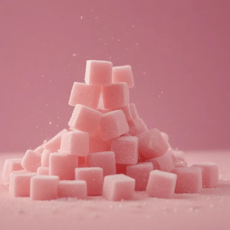 A pyramid of pink sugar cubes, soft and powdery, arranged in a diagonal composition, creating a warm, diffused glow that highlights their texture. The blurred pink background ensures the focus remains on the sugar cubes, providing a clean and unobtrusive backdrop.