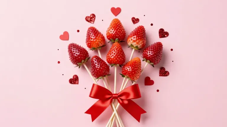 Glossy strawberries on skewers with red hearts scattered around, set against a soft, diffused light highlighting the vibrant red texture. The pale pink background with subtle red hearts creates a clean and elegant composition with ample copy space.