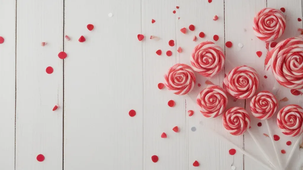 Close-up of glossy red and white swirl lollipops against a white wooden plank background, softly lit to create a warm glow. Shallow depth of field emphasizes the lollipops, leaving the background slightly blurred for a clean, focused composition.